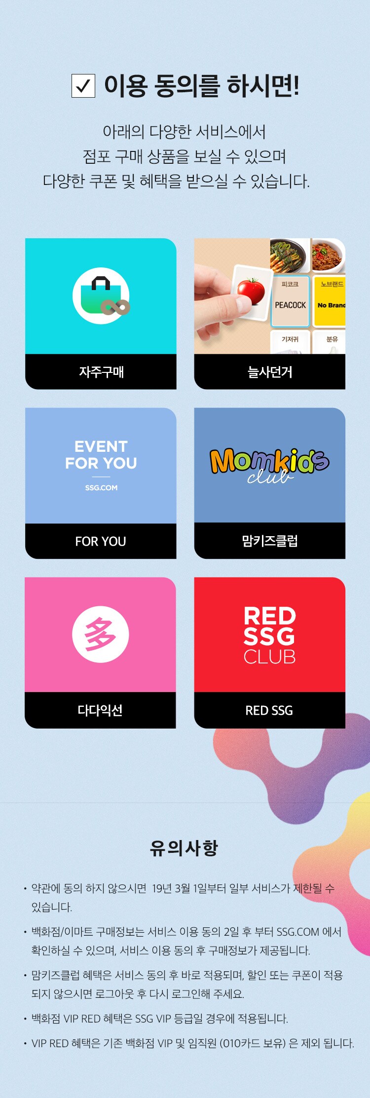 SSG.COM 옴니 서비스 : SSG.COM 의 각 코너에서 백화점/이마트의 점포 구매 상품을 쉽게 확인하고 맘키즈CLUB 쿠폰혜택, 백화점 RED VIP 혜택등을 누릴 수 있는 편리한 서비스입니다.